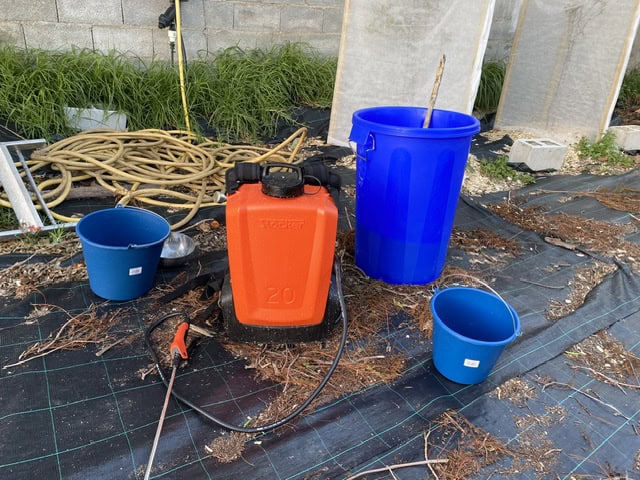 Plockade citroner och papaya-frukter att ta med hem och plockade ihop utemöbler och verktyg mm. Klippte klart gräsmattan och startade sista uppdraget som var att blanda näring i en tunna, fylla en ryggburen elektrisk spruta och ge de flesta fruktträden extra hjälp efter den tuffa vintern. Fick vänta tills solen inte var så stark längre men det skymmer snabbt så i värsta Ghostbuster-stilen ilade jag runt bland träden. Det gick förstås inte helt problemfritt, som det mesta idag, men lyckades ändå rätt så bra. Fick sätta på pannlampan på slutet när det blivit mörkt. Pust.